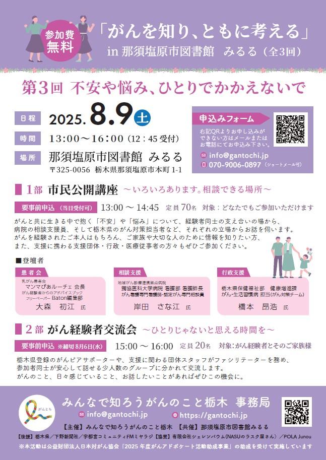 2025/08/09(土) 「がんを知り、ともに考える」in 那須塩原市図書館みるる 第3回 不安や悩み、ひとりでかかえないで