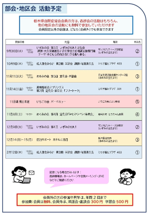 なお、現在、宇都宮市自閉症児者親の会のほか、県西自閉症児者親の会、県北自閉症児者親の会、県東自閉症児者親の会、県南自閉症児者親の会の5地区会で活動しています。
