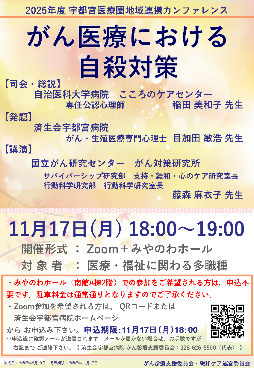 2025/11/17(月) 宇都宮医療圏地域連携カンファレンス 「がん医療における自殺対策」2025年11月05日 16:3418:00~19:00【会 場】済生会宇都宮病院 みやのわホール(またはオンライン)【参加費】無料(事前申込制)【対 象】どなたでも【定 員】-【申込先】お申し込みはコチラまで【主 催】済生会宇都宮病院 がん診療支援委員会・緩和ケア運営委員会◆◇プログラム◇◆【講演内容】「がん医療における自殺対策」国立がん研究センター がん対策研究所サバイバーシップ研究部 支持・緩和・心のケア研究室長行動科学研究部 行動科学研究室長藤森 麻衣子 先生2025/11/16(日) 公開シンポジウム 家族崩壊・児童虐待の現状と対策を考える2025/11/18(火) オレンジドア にしなす (毎月 第1・第3 火曜日)