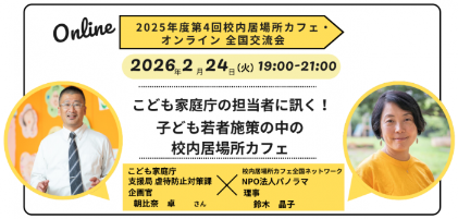 こども家庭庁 朝比奈卓さん(支援局虐待防止対策課 企画官)をゲストとしてお招きし、「子ども若者施策の中の校内居場所カフェ」について、校内居場所カフェ全国ネットワーク/NPO法人パノラマ理事の鈴木晶子とクロストークを展開していただきます。その後、ブレイクアウトルームに分かれ、ご参加者の皆さんで意見交換をしていただいたのち、質疑応答を行います。